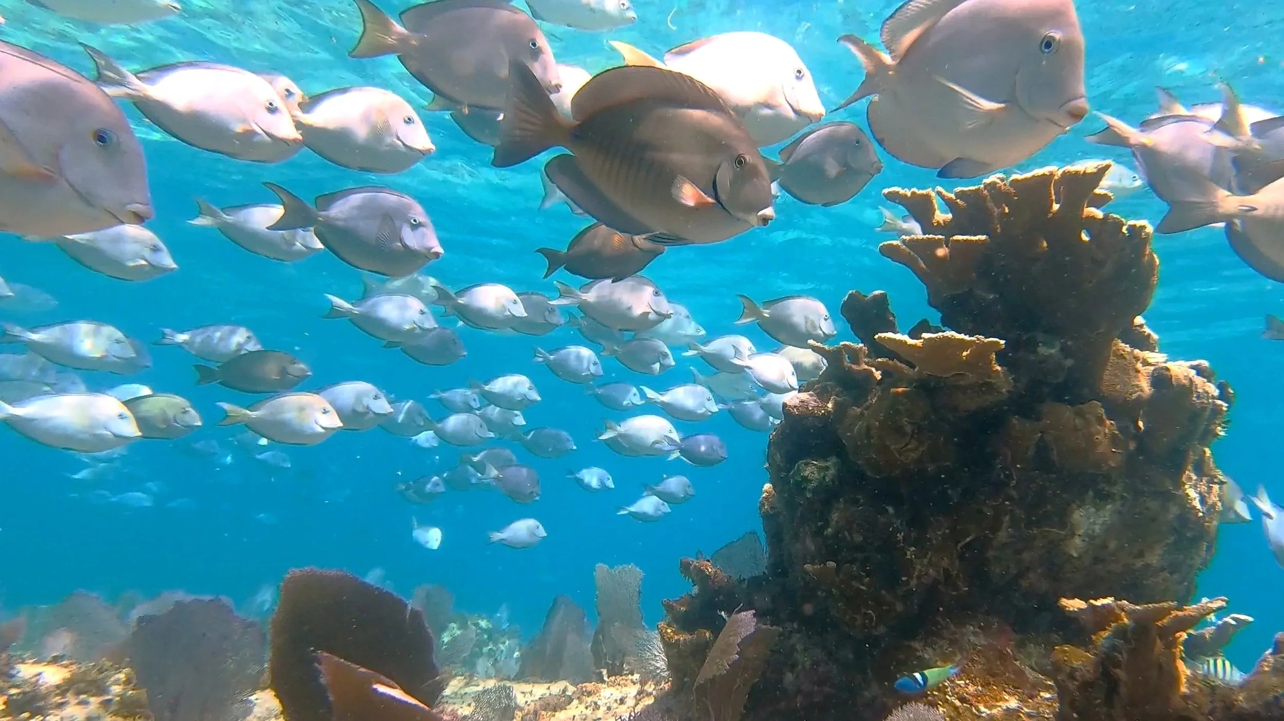 The shallow reefs are like swimming in an amazing fish filled aquarium with the sun shining down. The outer reefs are rough and deep with huge crevices. Beyond the outer reefs that break the surface, the same reefs continue below the surface about a hundred yards into the ocean. This below the surface outer reef area is my favorite. I love to swim down to the bottom of the crevices and watch the shimmering sun with the fish.
